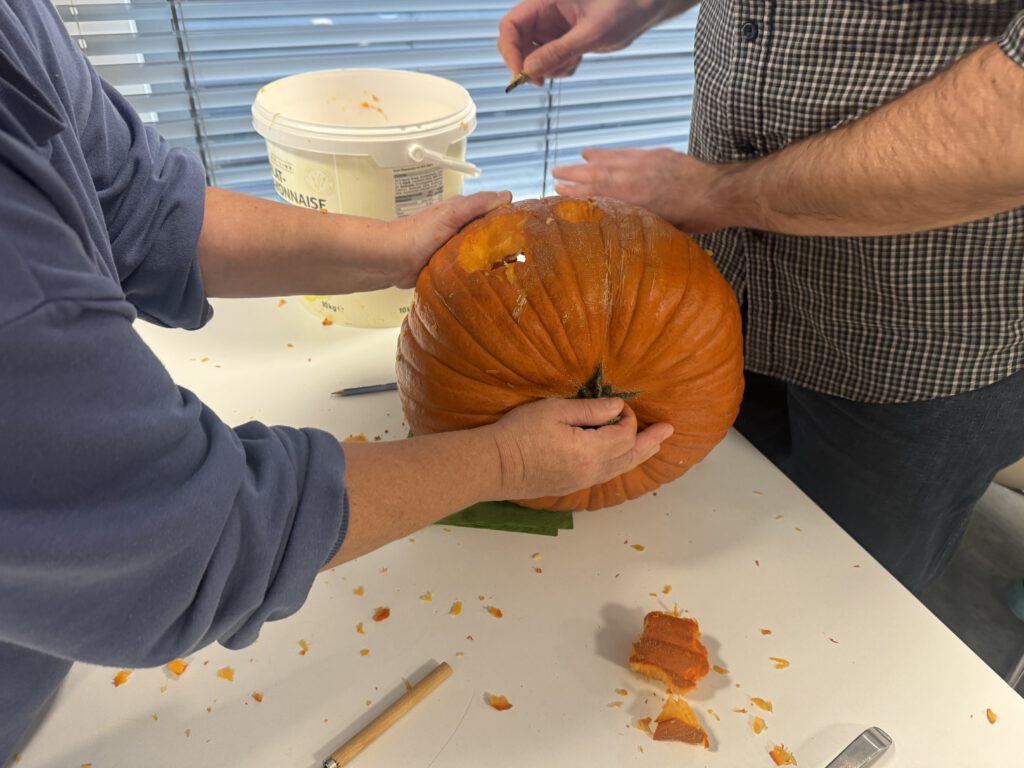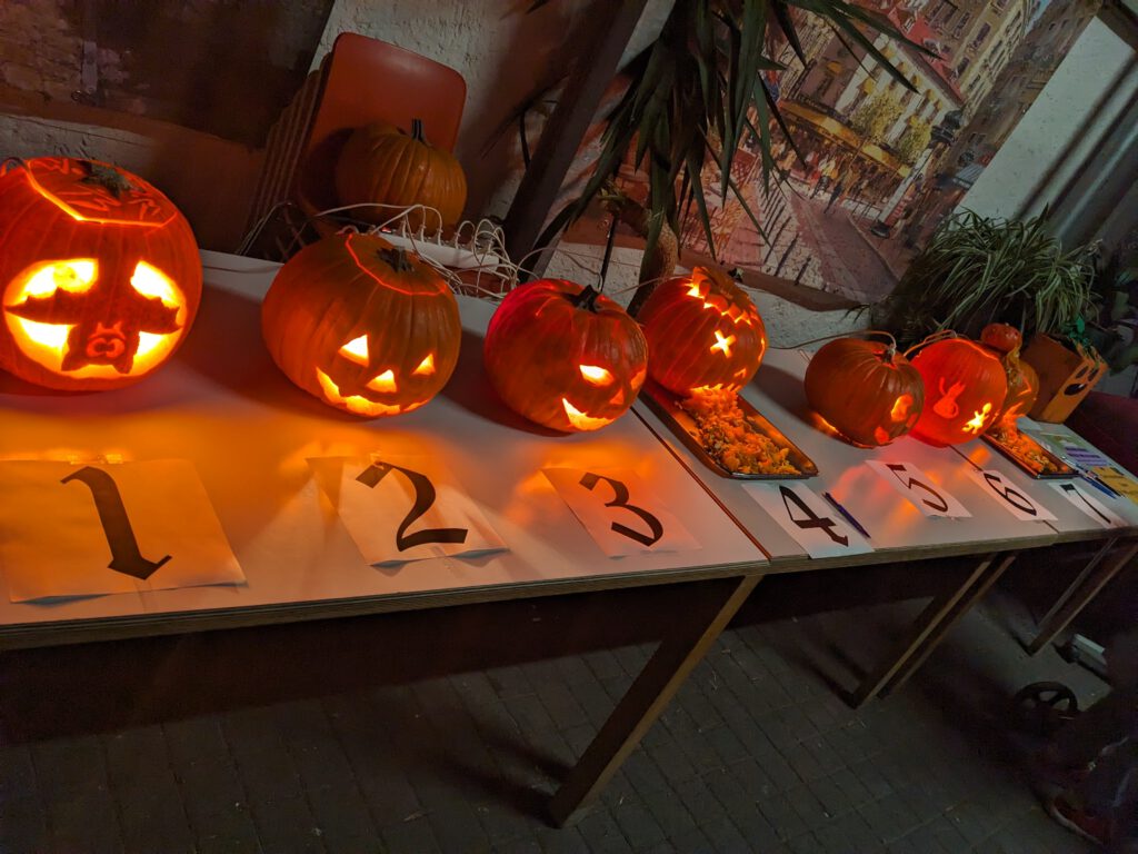 Auch in diesem Jahr haben wir den Anlass genutzt und ein gemeinsames Halloweenfest gefeiert. Zu schaurig-schöner Gruselmusik wurden Kürbisse nach ganz individuellen Ideen geschnitzt. Es entstanden klassische Kürbisgesichter bis hin zu kunstvollen Figuren und Musterungen, die dann am späten Nachmittag gekürt wurden. Den Tag rundete unser Karaokeabend ab, bei welchem die leckeren Gruselsnacks – und Getränke natürlich nicht fehlen durften.